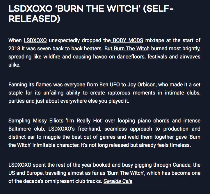 For Mixmag’s “Tracks of the Decade,” I captured LSDXOXO’s Burn the Witch: a wildfire track that reshaped spaces from basements to festivals, proof of how a single sound can set the scene.
